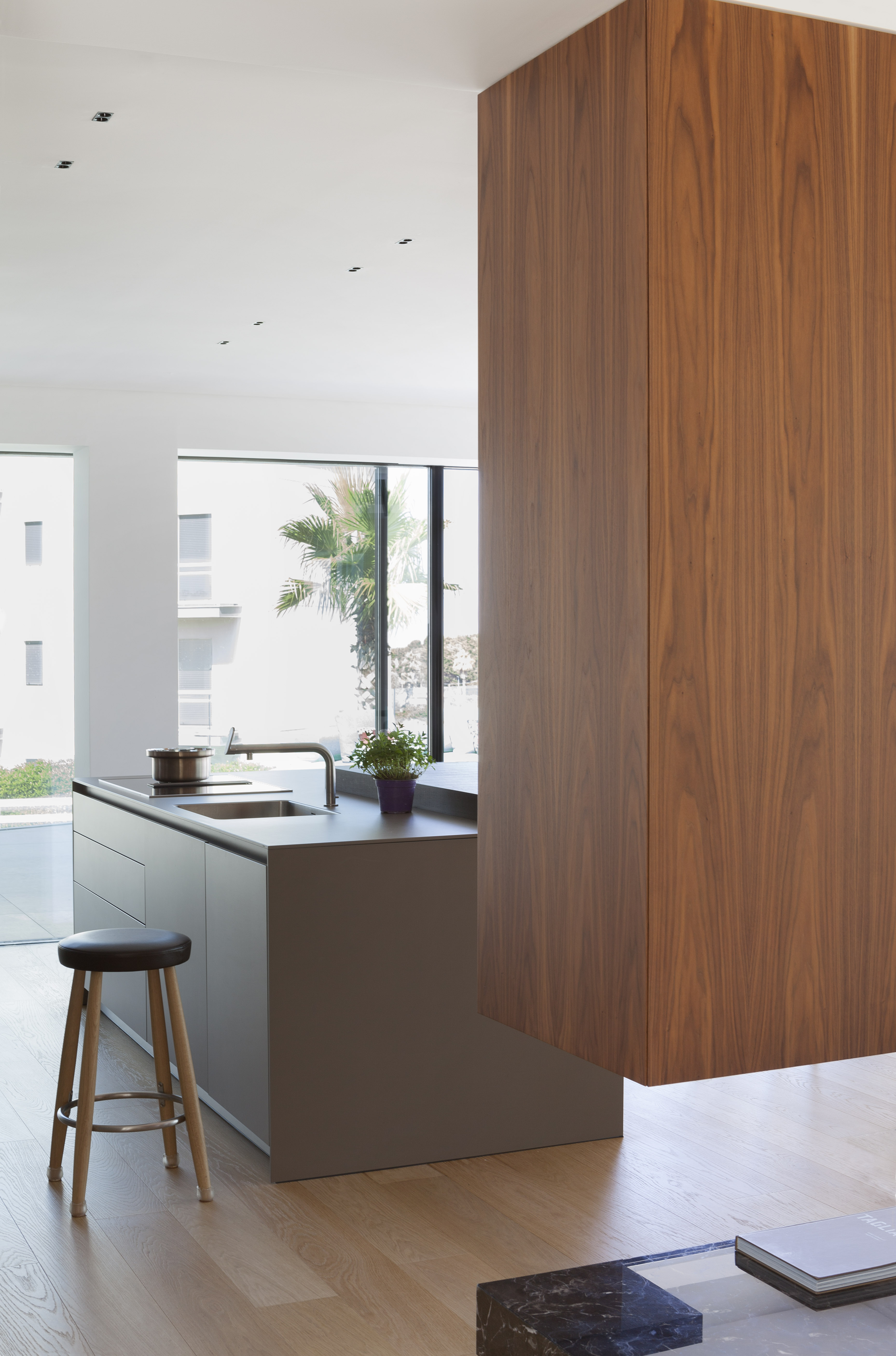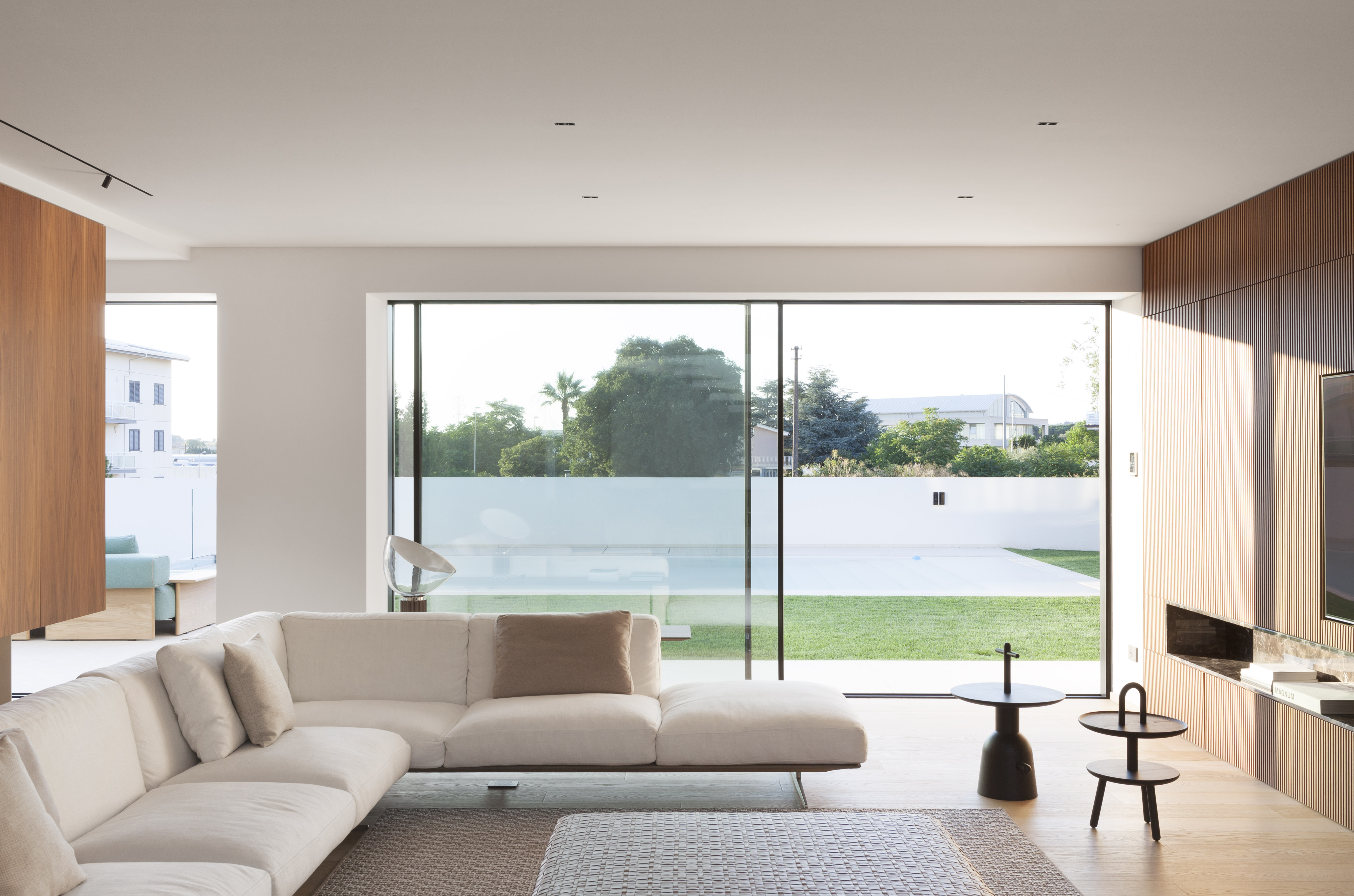 Il piano principale è caratterizzato da una "pianta libera" i cui spazi si articolano attorno a iperarredi, realizzati su misura, che separano/uniscono i vari ambienti: soggiorno, cucina e camera da letto padronale. Il piano seminterrato ospita una seconda cucina, la zona pranzo, una spa con hammam, area fitness e piscina coperta. L'ultimo piano è invece dedicato ai figli e si articola in: due camere da letto, di cui una doppia, ciascuna delle quali ha un bagno in camera e una cabina armadio; un'area studio su cui predomina una grande libreria realizzata su misura, e da cui si accede al tetto giardino che si affaccia sulla piscina del piano sottostante.